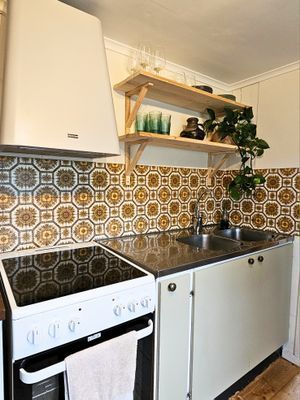 Vi har behållit de gamla spegeldörrarna, lyft fram det vackra, gamla trägolvet på nedervåningen som kommer från egen skog i området. I hallen har ursprungstaket fått komma fram och i sovrummet ser du tydligt de gamla träbalkarna. Fönstrens djup talar också för sig själva. I köket har den gamla plastmattan som fungerar som "kakel" fått vara kvar med sin charm och påminner oss om det portugisiska kaklet "Azulejo" och i vardagsrummet pryder fortfarande den gamla skogstapeten från 70-talet, likaså den vackra blomtapeten i matrummet.