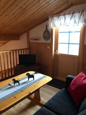 Stugan utgör ena delen av ett rött timrat parhus och är mycket trevlig och fräsch och räcker mer än väl till för 8 personer.