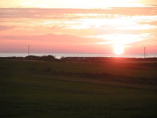 Gemensam grillplats med havsutsikt, och solnedgång.