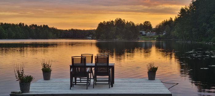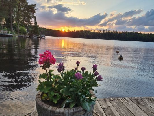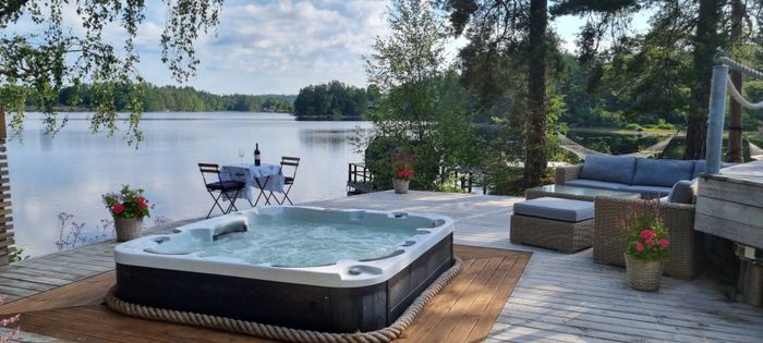 Ett paradis med strandtomt på en udde vid frisjön, där du har tillgång till spabad ,bastuflotte, båt och fiske, strax utanför Borås.