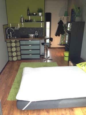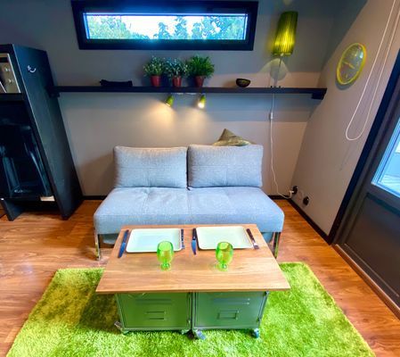 Beachvillan15m2: Ett rum med 140cm bred bäddsoffa. Litet pentry med induktionshäll, micro, kylskåp med frysfack samt Toa/Dusch.