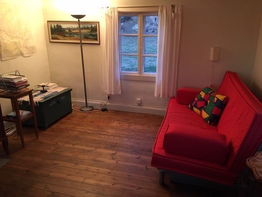 Mysig stuga 300m från Verkebäcksviken och hamnen. Stugan har storstuga med