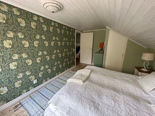 En trappa leder upp till sovavdelningen på tredje plan, med ett dubbelsovrum med dusch, handfat och toalett, två sovrum med två bäddar i varje. Samt i den stora hallen tre sängar på rad, två stycken 120 cm och en säng 90 cm bred.