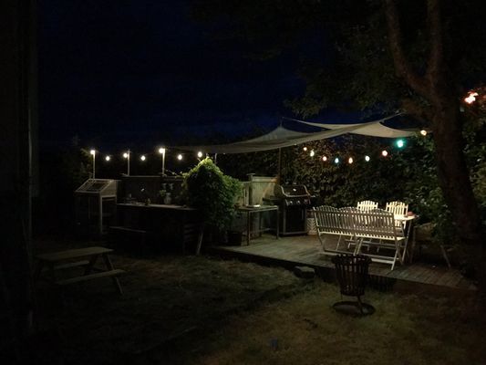 En innerträdgård och stor äng omger stället. Huset ligger privat och är en av 8 i byn, de flesta sommarhus. Trädgården är lummigt med uteplats med utemöbler och grill. Det finns sittplatser för 12 personer vid det stora bordet på uteplatsen.