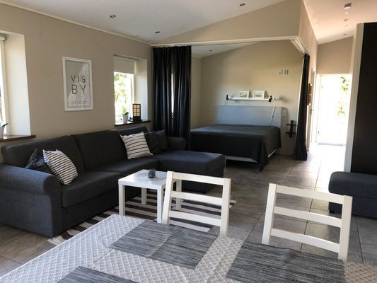 Lägenheten finns i en utbyggnad av ett annat bostadshus. Uteplatsen har förmiddagssol och tidig kvällssol och ligger avskild och relativt insynsskyddad. Man har i stort sett en egen del av trädgård med gröna ytor att använda om man vill. Grill och solstolar finns och parkeringen för bil finns intill den egna ytterdörren med kodlås. Det finns även ett gårdshus på tomten med 6 bäddar att hyra om ni är ett större resesällskap. De 3 bostäderna på tomten har alltså sin egen sektion av trädgården och hänsyn ang. ljudnivån får man beakta utifrån tiden på dygnet.