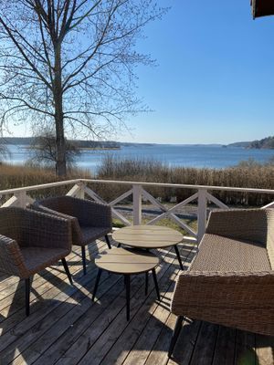 Nedanför vägen finns den privata badbryggan. I hyran ingår en aluminiumbåt (godkänd för 4 vuxna) med 4 hk motor med båtplats vid bryggan.