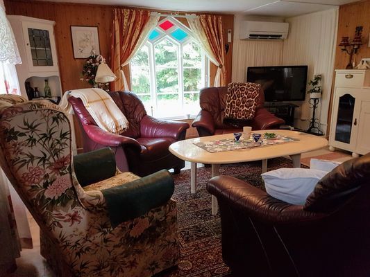 Allrum: matsalsmöbler, soffgrupp och tv, dvd. Internetanslutning finns.