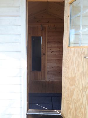 Gäststugan har en bäddsoffa som blir en dubbelsäng. Våningssäng 2 st bäddar.