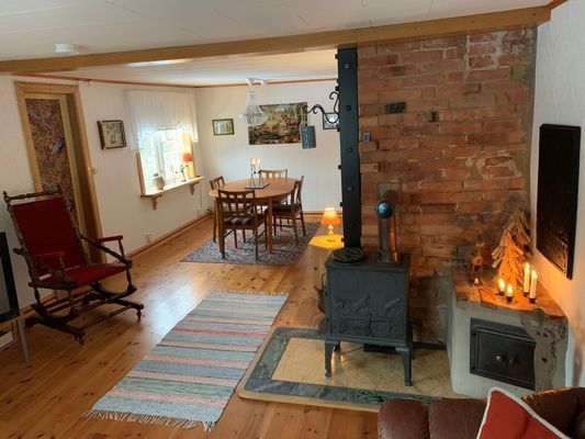 Det nedre planet har utöver kök och badrum ett stort matrum kombinerat med allrum innehållande bland annat vedeldad spis, TV, DVD-spelare.