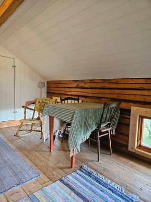På övervåningen finns 2 sovrum och ett stort allrum.Upp till 9 bäddar. Fr.o.m. i höst är det möjligt att hyra månadsvis. Från 900 kr/natt. 6000 kr/vecka under sommaren (inklusive avgift till Stugknuten). Medtag egna sängkläder och handdukar eller hyr för 100 kr per person.