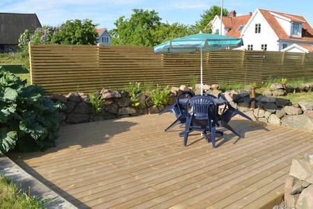 Egen uteplats med både gräsmatta och trädäck, där det går utmärkt att både sola, grilla och äta ostört.