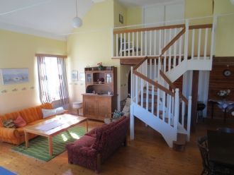 Stort allrum: Stort matbord. Tv med Astra-parabol, soffgrupp, kamin, utsikt mot sjön.