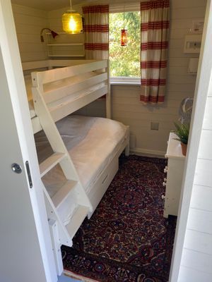 Sjöboden (hus nummer tre) om ca 10 kvm. Inrymmer en familjesäng (120+90 cm), bra förvaring och mysigt inrett. Här kan tex den lilla familjen sova, två vuxna och ett barn eller ett gäng tonåringar.