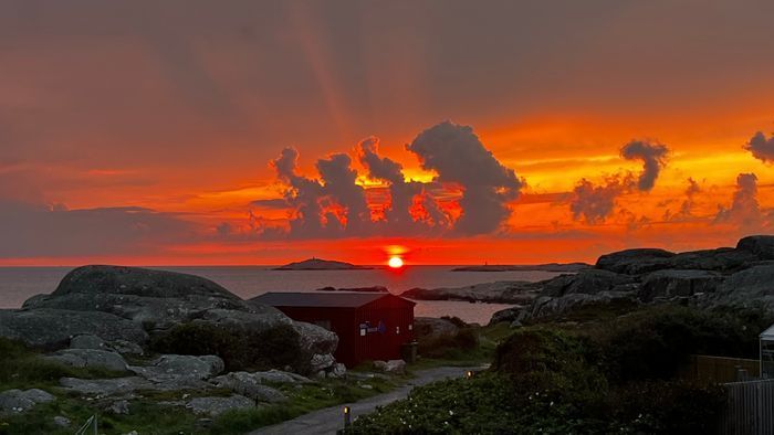 I söder reser sig Vinga fyr som efter skymningen tänder sitt karakteristiska sken och sveper över allt som omges, både när och fjärran.