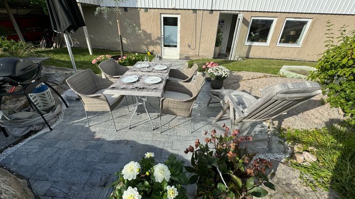 Två stycken uteplatser med utemöbler och grill. Den på baksidan är helt omgjord 2024.