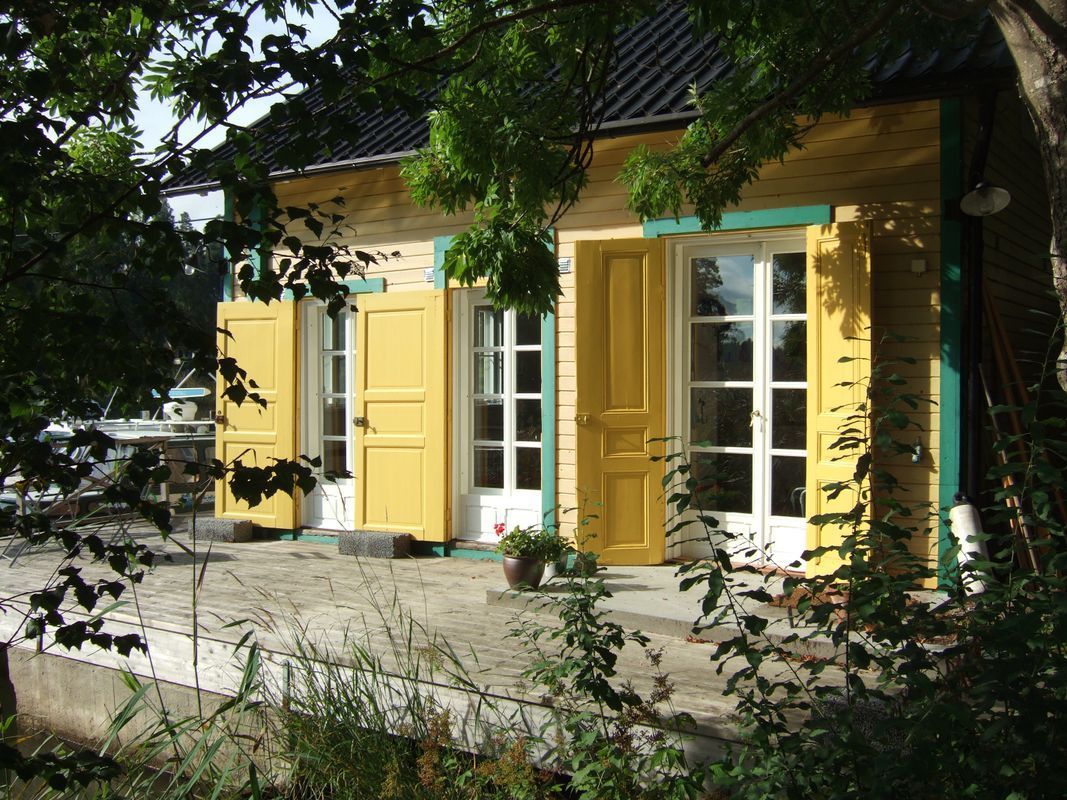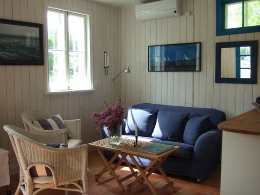Charmig Sjöstuga till anrika Villa Gustafslund. Ursprungligen byggd 1890 som traditionell sjöbod men som varsamt renoverats på senare år. Bryggan med soldäck omger huset på tre håll. Boytan är 35 m2 på bottenvåningen med en öppen planlösning plus ytterligare ca 35 m2 på övre våning / sovloft med ståhöjd i mitten men minskande mot sidorna. Halvfranska fönsterdörrar släpper in solen i generösa mått. Nedre planet har vackert klinkersgolv med golvvärme. Gott köksutrymme med spis & ugn, micro samt kyl och frys. Separat matplats vid fönstret, - eller så dukar man direkt ute på bryggan i utemöblerna där när vädret tillåter ! Perfekt för grillen ! Tvättmaskin med tork är snyggt inbyggd i vägg. Helkaklad dusch med separat WC. Luftkonditionering och/eller värme även från luft/luftare. 2 fönster även i söder på nedre plan. Soffa på nedervåningen och stor dubbelsäng på övervåningen med sjöutsikt även här. För ev. barn finns 2 ihopfällbara extrasängar. Värdparet bor i fastighetens huvudbyggnad i backen 50 m upp från sjön och där även parkeringsplats finns. Området är naturskönt och lugnt med mycket besök av bla rådjur och ett rikt sjöfågelliv i närheten. Huset ligger vid slutet av återvändsväg med minimal biltrafik även om vägen överhuvudtaget inte syns från Sjöstugan. Närheten till Velamsunds Naturreservat inbjuder till många och omväxlande skogspromenader eller skidturer vintertid. Elljusspår för löpning och skidåkning. Bara 10 min till Orminge Centrum med allt i form av mataffärer, butiker och samhällsservice. Buss till Stockholm (Slussen) minst 1 ggn/timme från hållplats 600 m håll. Waxholmsbåt till Stckholm eller ut till skärgården lägger till vid Risets brygga, ca 1,5 km bort. Vi välkomnar gärna hundar och delvis inhägnade naturträdgård är underbar för vovvar att rasa runt i och stranden att bada ifrån !!