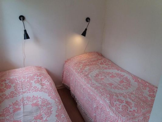 Inne i huset finns fyra bäddar - två i ett separat sovrum med två sängar från Ikea (1x80 cm bred och 1x90 cm bred) och två i vardagsrummet iform av en nyinköpt bekväm bäddsoffa, även den Ikea, med 160 cm bred madrass (2*80 cm).