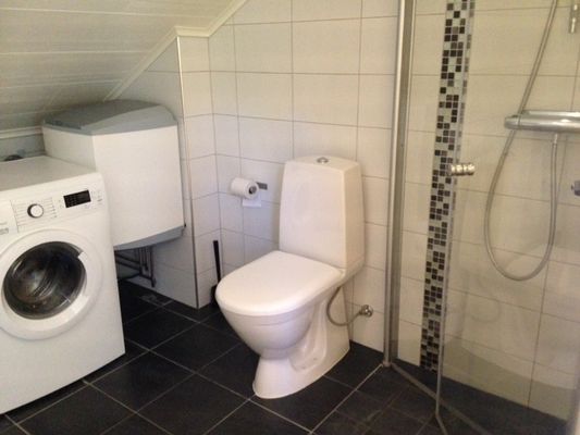 I det moderna badrummet finns handfat, toalett, dusch och tvättmaskin.