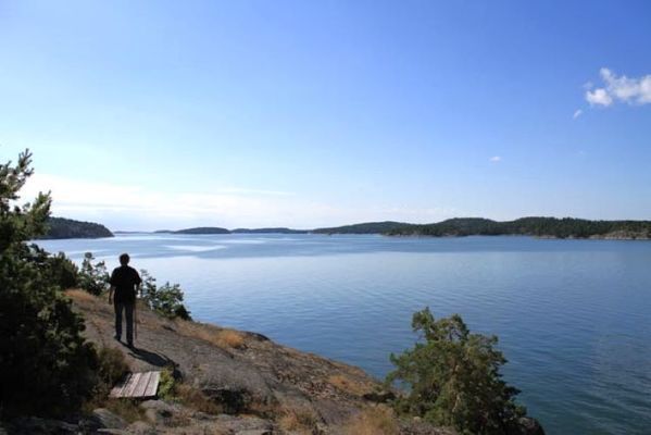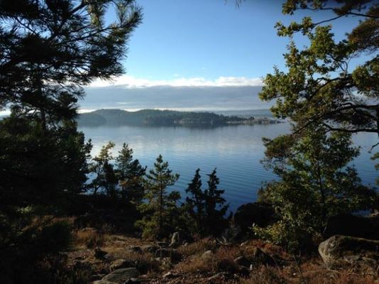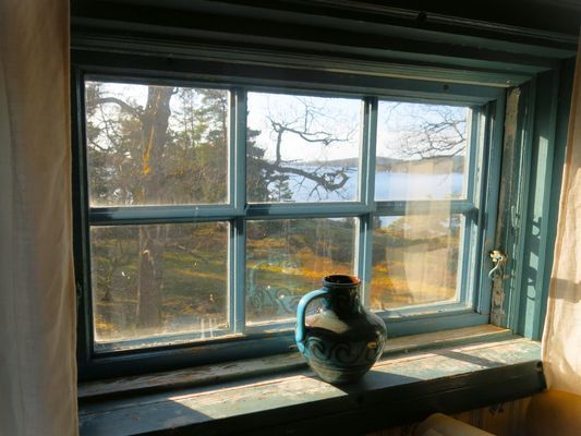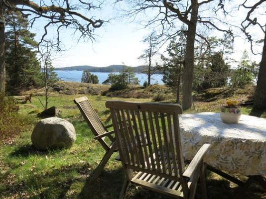 Från gårdsplanen framför huset är vyn över fjärden betagande. Från baksidan syns också ägarfamiljens boningshus samt lite längre bort ett mindre sommarhus.