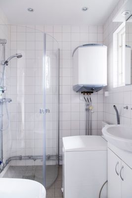 Toalett, WC, dusch och tvättmaskin.