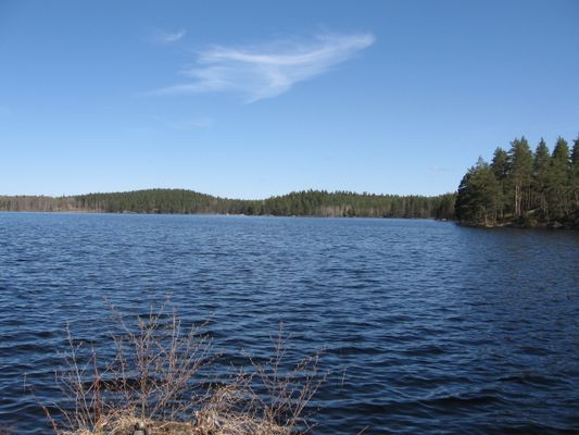 Mellan träd och stenar kan du se Bysjönens glitter och gnista.