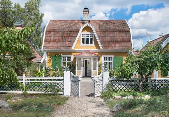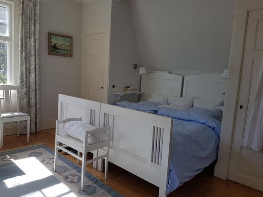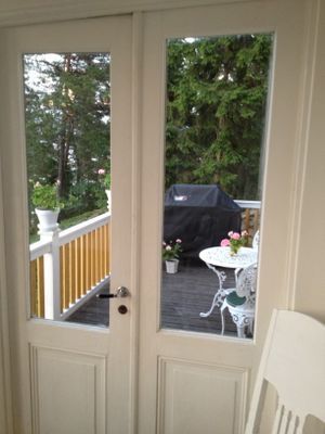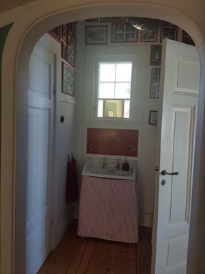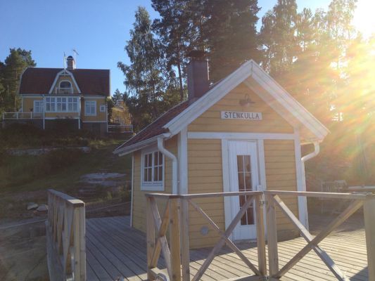 Gammalt hus från 1909 med mycket bevarad sekelskiftscharm. Featured i Sköna Hem, House & Antiques samt Hyttemagasinet. Huvudbyggnaden har ett master bedroom med dubbelsäng, handfat, toalett och dusch. Egen balkong med magnifik sjöutsikt. Perfekt för frukost, drink eller läsning i vindskyddat utrymme. På övervåningen finns ytterligare ett sovrum med en bädd, samt ett sovrum med dubbelsäng och handfat. I bottenvåningen finns ett stort kök med spis, ugn, mikro, stor kyl med frys. Matplats för 6 pers. Sjöutsikt från diskhon. Köksveranda med sjöutsikt åt två håll. Punschveranda med hänförande sjöutsikt och solnedgång med plats för 10-12 pers. Perfekt för alla måltider, pussel eller kortspel. Stor kombinerad matsal och vardagsrum med TV. Toalett med dusch på bottenvåningen. Luftvärmepumpar på över och bottenvåningen för AC vid varma dagar. Wifi.