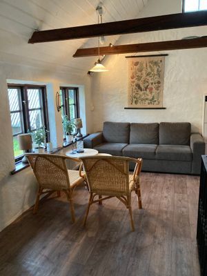 Huset har ett sovrum med en dubbelsäng 2*90cm och en juniorsäng. Det finns ett sovloft med två 90cm sängar och på tomten finns det en stuga med två 80cm sängar och en juniorsäng som kan nyttjas. I huset finns ett allrum med en soffdel och en matplats med ett matbordet som har två iläggsskivor och det finns tre extra stolar. Rummet har även en liten tv-hörna. Det är ett badrum med dusch och toalett.