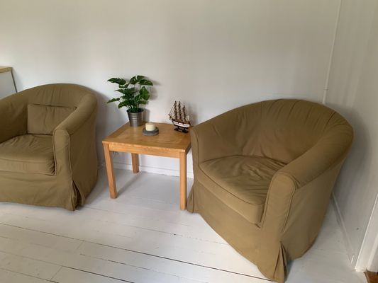 Uteplatser i olika väderstreck beroende på om man vill ha morgon eller kvällssol och det finns grillmöjligheter med kolgrill. Litet charmigt kök utrustat med kyl, frys, kaffekokare, vattenkokare, spis med ugn och en extra induktionshäll, diskmaskin, mikrovågsugn, sodastream och brödrost. Badrum med toalett, dusch och tvättmaskin.