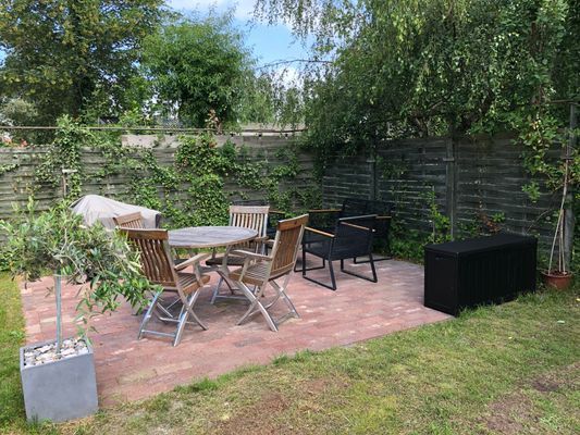 Uppvuxen , barnvänlig naturtomt med 3 stenlagda uteplatser med utemöbler.