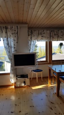 Storstuga med väl tilltagen hörnsoffa vid vridbar platt TV med Telias basutbud samt öppen spis.