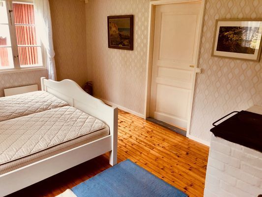 Från köket är också det undre sovrummet, utrustat med dubbelsäng (2x90x200), nattduksbord, byrå, gammal köksugn men också 2 elektriska värmare för övergångsperioden - perfekt för äldre herrar eller de unga trummorna som kan vara lite mindre störda.