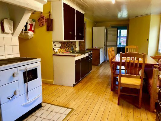 Genom dörren till vänster kommer du in i köket, som med modern kyl-frys (ny 2018), mikrovågsugn (ny 2018), vattenkokare (ny 2018), kaffebryggare, brödrost (ny 2018), matlagningsmaskin (en trävärmd Spis - när vi tog över huset ville vi kasta ut det ... hur dumma vi var: saken är fantastisk, du får ugnen upp till 300 grader, pizza från den här ugnen är så mycket bättre än den konventionella Elektroding, värmer under övergångsperioden det feta vithetet i hela köket, vi ger det aldrig tillbaka!), elektrisk spis med keramikhäll och konvektion (nytt år 2019), båda inbyggda i en gammal skorsten, bord, stolar och bänk för 8 personer och en riklig komplett uppsättning krukor, kokkärl , Tallrikar, bestick, glas och annat.