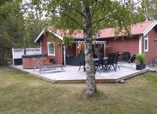 Uteplats 1: (dag & kvällssol, söder & väster) altanen är 60kvm. Ny badtunna våren 2022 (ved ingår ej, men Björkved kan köpas till antingen via oss eller själv.)