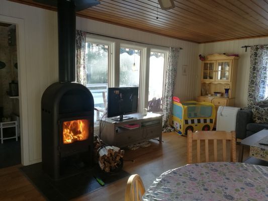 V-rum: Soffgrupp m soffbord, Smart-TV där man kan logga in på sina streamingtjänster (t ex Netflix mm) med hdmi & usb ingång samt hårddisk med barnfilmer mm. Wi-Fi-Bredband 250/100. Braskamin (lite ved till den ingår sommartid), Takfläkt & portabel AC.
