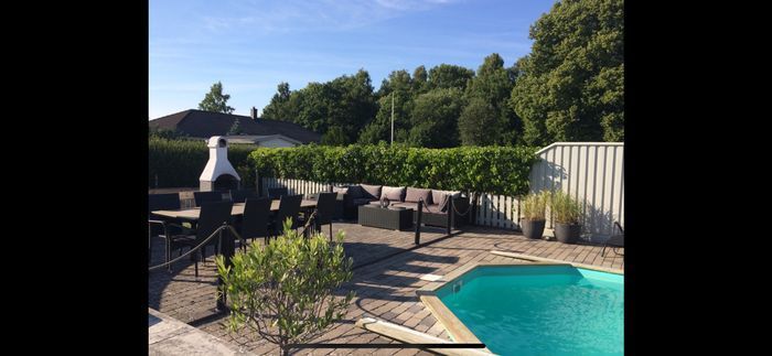 I trädgården finns studsmatta samt uppvärmd pool 7x4 meter m.m. Bredvid poolen finns ytterligare en matplats, loungedel och grill.