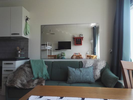 Lägenheten, 22 m², ligger på plan 4, mot söder. Allrum med TV, 1 våningssäng och
