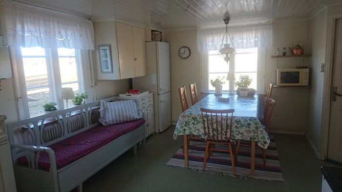 Ett hus från 1800-talet med 4 rum och kök, varav 1 ljust och mysigt vindsrum, samt dusch och toalett. Inredning i genuin gammaldags stil. Lantligt beläget på aktivt brukad gård. Havsnära med havsutsikt. Promenadavstånd till fina badplatser.