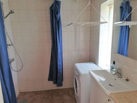 Bottenvåning: Allrum med matplats och kök, två sovrum med dubbelsängar, badrum med tvättmaskin. Köket utrustat med induktionshäll, ugn, kyl, frys och diskmaskin.