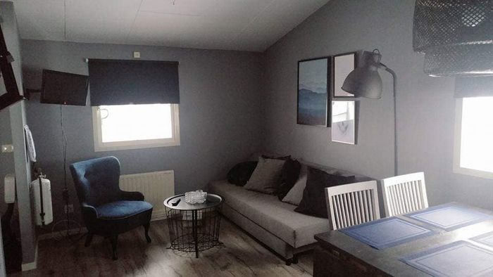 Köket är litet passar sig främst om du vill värma medhavd mat men utrustat med häll, ugn, mikro, kyl/frys och matplats för 4 personer.