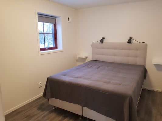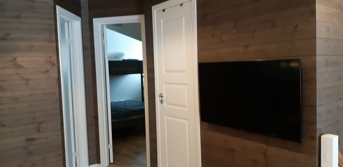 Nedre plan med storstuga/kök, 2 sovrum med dubbelsängar, toalett med dusch och bastu, braskamin, torkskåp och fullutrustat kök.