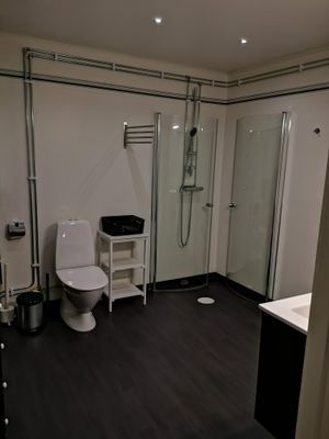Ett rymligt badrum med dusch och tvättmaskin. Lite sällskapsspel finns. Man har egen ingång. Möblerad uteplats med grillmöjligheter och egen parkering. Trädgård delas med hyresvärd.