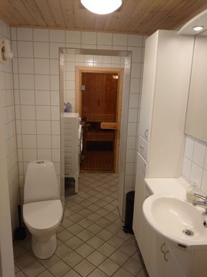 Badrum med toalett, dusch, bastu, tvättmaskin med inbyggd torktumlare. På nedervåningen finns förutom kök och badrum ett vardagsrum med en 2-sits soffa och en fåtölj och ett sovrum med dubbelsäng med plats för två personer (180 cm bred säng) och rymlig garderob. Hela ovanvåningen som är ett stort rum har två st enkelsängar (90 cm) och en dubbelsäng (140 cm). Spjälsäng finns vid behov.