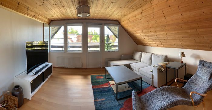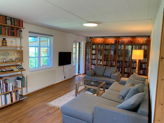Ovanvåning med stort sällskapsrum, öppen spis och två sovrum med två sängar i varje sovrum samt divansoffa med bäddmöjlighet i stora rummet (4+1 bäddar), toalett med badkar och allrum med och storbildsskärm (67”) och 300w soundbar och 4K chrome-cast. Sängarna i sovrummen kan möbleras som dubbel- eller enkel-sängar efter ert behov.