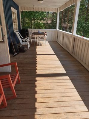 Stor, öppen planlösning kök/vardagsrum (tv finns), soffa med plats för åtta personer, matbord med plats för upp till tio personer. Fräscht helkaklat badrum med dusch och tvättmaskin. På den stora inbyggda altanen kan ni avnjuta stillheten och lugnet medan ni blickar ut över Ore älv. Webergrill finns att använda, även höst och vinter.