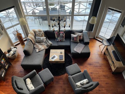 Stuga på 140 m2 med sagolik utsikt mot fjäll och Lofssjön med mycket stora umgängesytor - en stuga att trivas och umgås i: