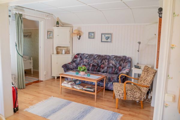 Hus 1: Här finner du ett allrum med soffa och soffbord samt ett sovrum med 2 enkelsängar och en våningssäng. Det finns även en tillhörande toalett med dusch här.