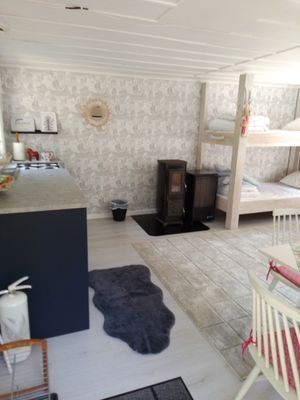 Lillstugan : Våningsäng+ Bäddsoffa. Litet kök med gasolspis och ugn. Gasolvärmare.