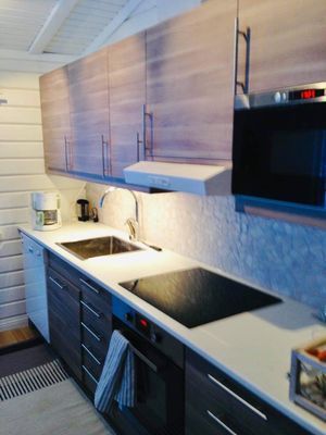 Fullt utrustat kök med diskmaskin och mikrovågsugn och med matplats för sex personer vid det stora bordet och fyra personer vid det mindre bordet.