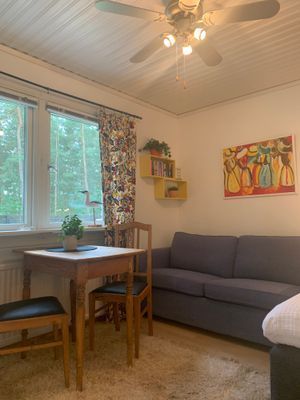 Mysigt boende på 25kvadrat i ena vinkeln av en stor villa med egen ingång på baksidan av huset och privat terass med utsikt åt trädgården & skogen. Det finns alla moderna bekvämligheter som Wi-Fi, takfläkt, toa, dusch, tvättmaskin, TV, kök med ugn kyl/frys mikrovågsugn, utemöbler & parkering.