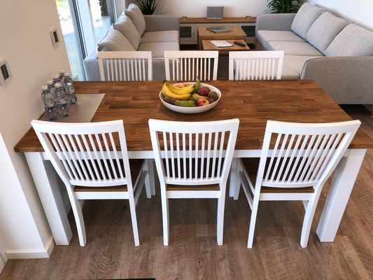"Stora älg" med sina ca 120m² boyta erbjuder tillräckligt med plats för upp till 8 personer. Huset är mycket modernt och byggt och utrustat till en mycket hög standard (central ventilationssystem med filterteknik, FB värme, EIB/KNX, etc.).